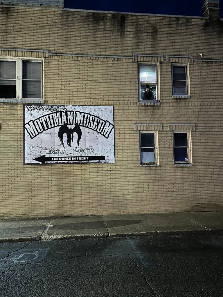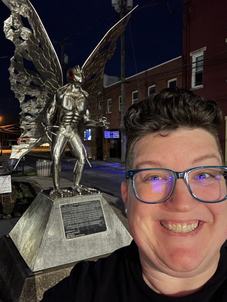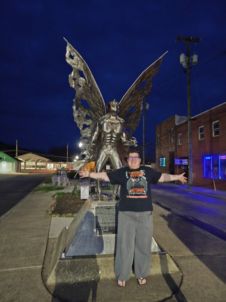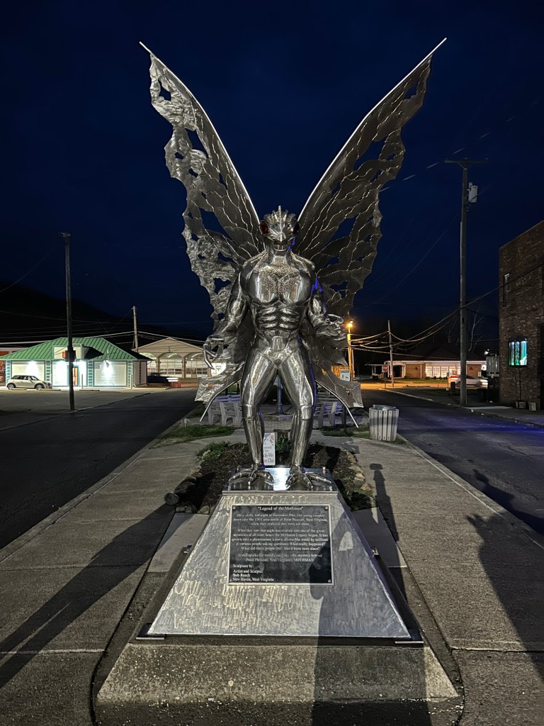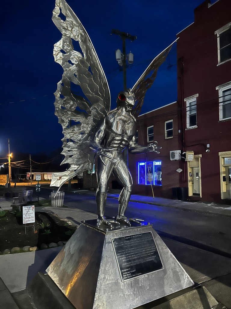 You’re never too old to fanboy over a cryptid statue at 9 o’clock at night in a small West Virginia town. On a very empty street. With a creepy mannequin watching you.