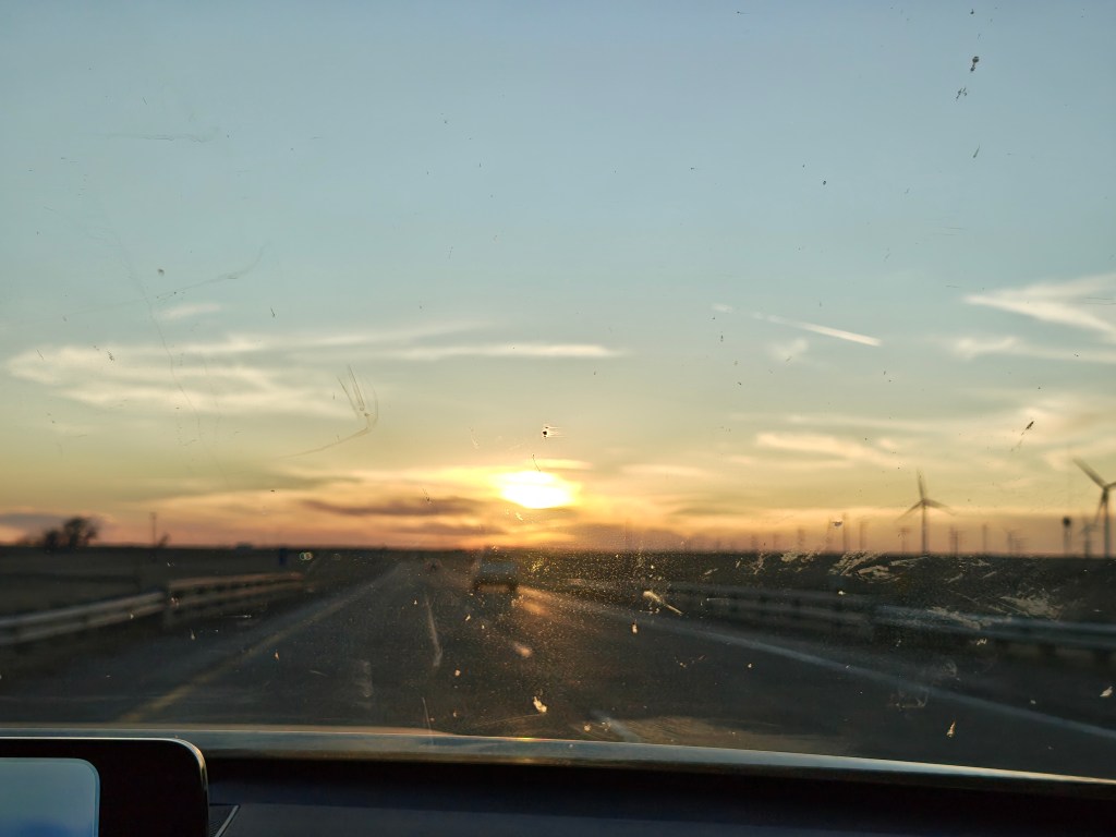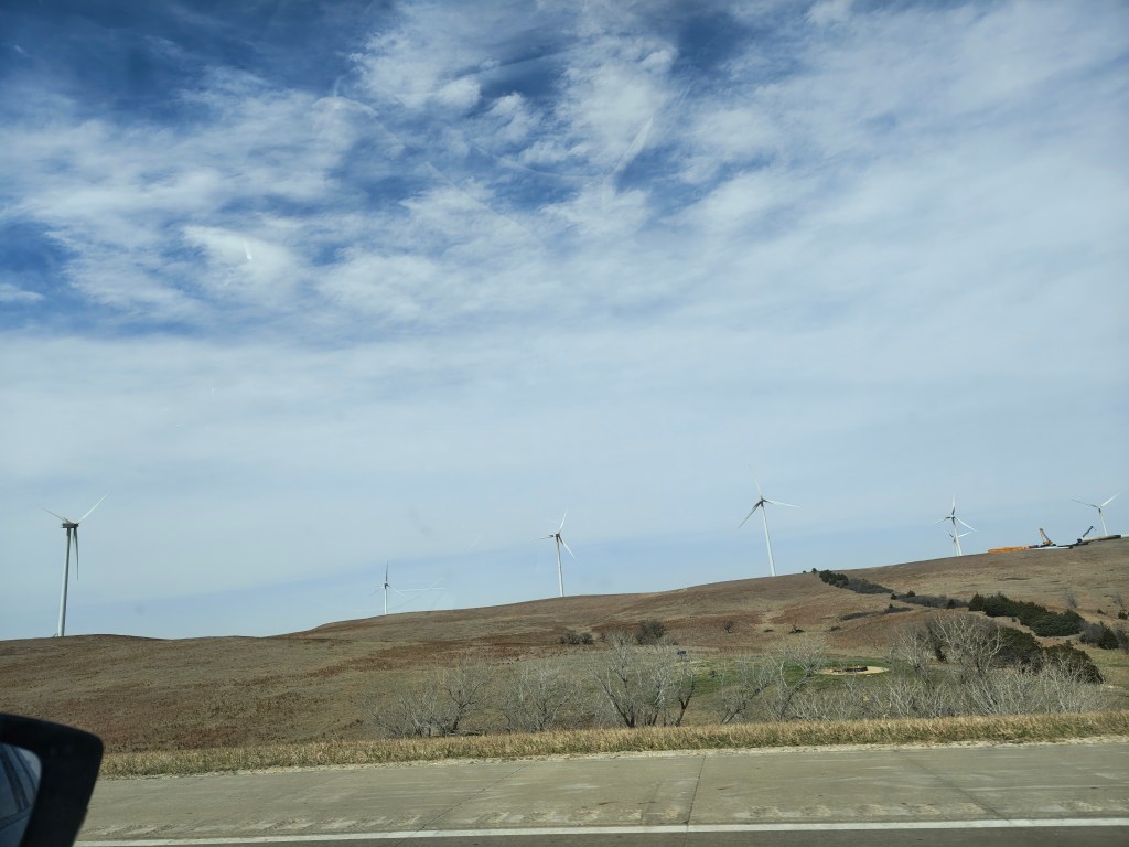 The transition in the landscape was really fun to watch, in addition to the myriad of cows we encountered along the roadsides. For example, there were these hills with very rich black soil. Just miles of them. And of course – the wind farms! Even though I’ve seen plenty a giant ass windmill on my journeys through western PA, it just slaps a little different when they’re sprawling across a plain. There were so many, and at one point the direction of the sunlight made them all appear black.